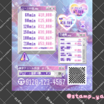 ▲Sampleのものはコース時間を6枠、交通費を5枠、コースアップ料金(時間ごと定額のお店として仮定)や延長料金をハートで、左下にお店の名前と源氏名、電話番号、右下にヘブンのQRコードを載せるイメージで作っています。