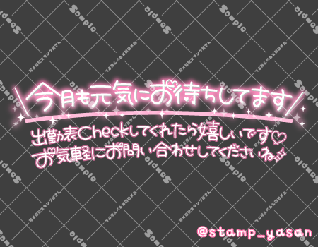「今月も元気にお待ちしてます 出勤表Checkしてくれたら嬉しいです♡お気軽にお問い合わせしてくださいね」のスタンプ
