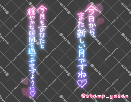 「今日から、また新しい月ですね♡」「今月もあなたと穏やかな時間を過ごせますように♡」のスタンプ