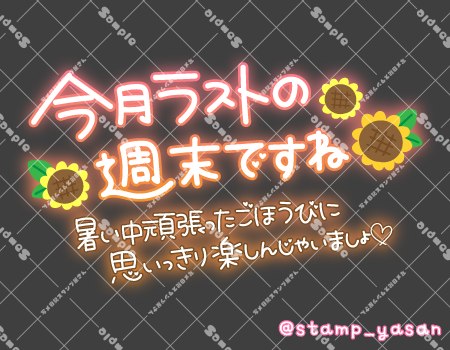 「今月ラストの週末ですね 暑い中頑張ったごほうびに思いっきり楽しんじゃいましょ」のスタンプ