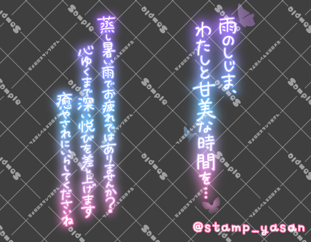 「雨のしじま、わたしと甘美な時間を…」「蒸し暑い雨でお疲れではありませんか?心ゆくまで深い悦びを差し上げます 癒やされにいらしてくださいね」のスタンプ(縦書き)