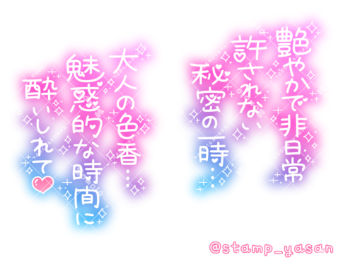 「艶やかで非日常 許されない秘密の一時…」「大人の色香…魅惑的な時間に酔いしれて」のスタンプ(縦書き)