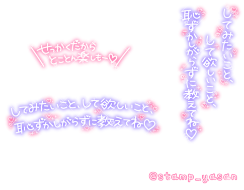 「せっかくだからとことん楽しもー」「してみたいこと、して欲しいこと、恥ずかしがらずに教えてね」のスタンプ(縦書き有)