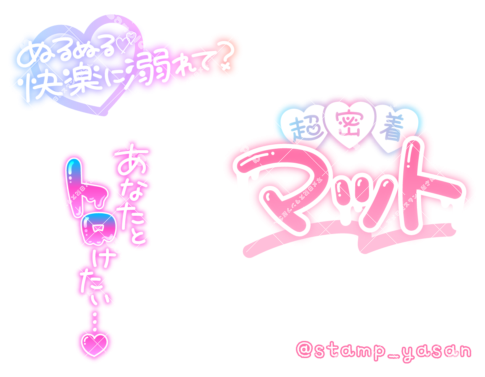 「超密着マット」「ぬるぬる快楽におぼれて?」「あなたとトロけたい…」のスタンプ(縦書き有)