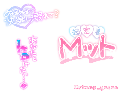 「超密着Mット」「ぬるぬる快楽におぼれて?」「あなたとトロけたい…」のスタンプ(縦書き有)