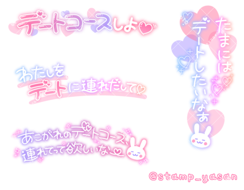 「デートコースしよ」「わたしをデートに連れだして」「あこがれのデートコース、連れてって欲しいな〜」「たまにはデートしたいなぁ」のスタンプ(縦書き有)