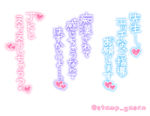 「先生…っ♡エッチなご指導お願いします」「痴漢されて感じちゃうなんてはずかしいよ…っ」「JKとえちえちしちゃう?」のスタンプ(縦書き)