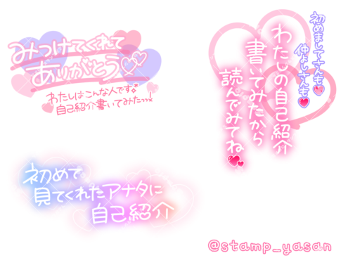 「みつけてくれてありがとう♡わたしはこんな人です 自己紹介書いてみた」「初めて見てくれたアナタに自己紹介」「初めましてさんも仲よしさんもわたしの自己紹介書いてみたから読んでみてね」のスタンプ(縦書き有)