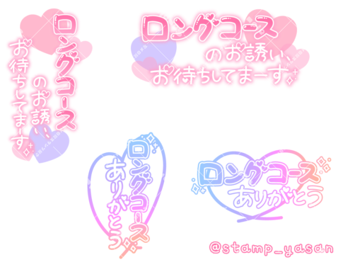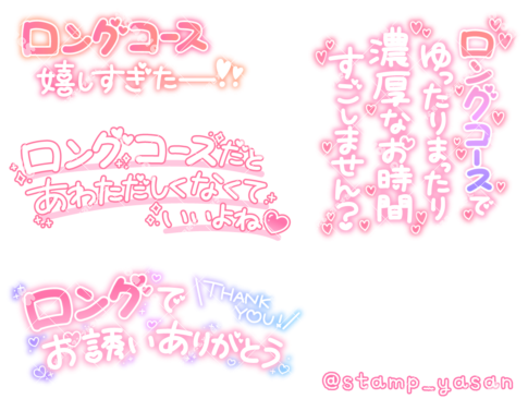 「ロングコース嬉しすぎたー!!」「ロングコースでゆったりまったり濃厚なお時間すごしません?」等ロングコースのスタンプ(縦書き有)