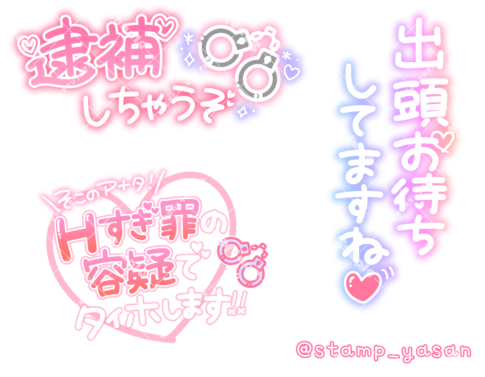 「逮捕しちゃうぞ」「出頭お待ちしてますね」「Hすぎ罪の容疑でタイホします!!」のスタンプ(縦書き有)