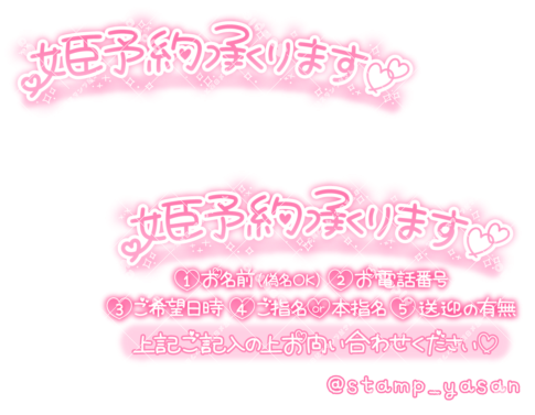 「姫予約承ります」「姫予約承ります ①お名前(偽名OK)②お電話番号③ご希望日時④コース⑤ご指名or本指名⑥ご利用場所/上記ご記入の上お問い合わせください」のスタンプ