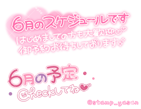 「6月のスケジュールです はじめましての方も大歓迎 御予約お待ちしております」「6月の予定 Checkしてね」のスタンプ