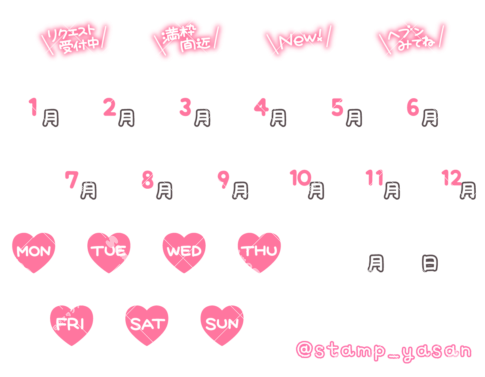 ハートの月日曜日スタンプ&「リクエスト受付中」「満枠間近」「New!」「ヘブンみてね」のスタンプ