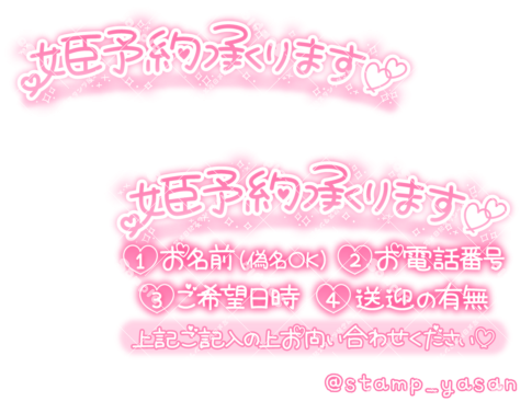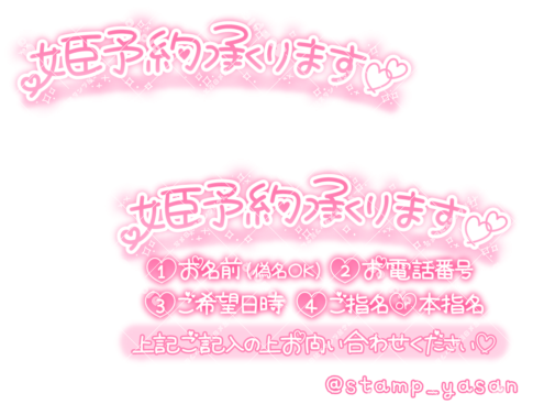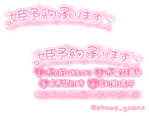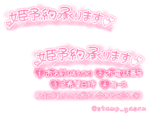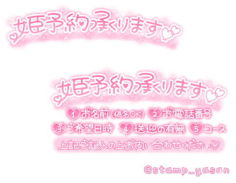 「姫予約承ります」「姫予約承ります ①お名前(偽名OK)②お電話番号③ご希望日時④コース⑤ご利用場所/上記ご記入の上お問い合わせください」のスタンプ