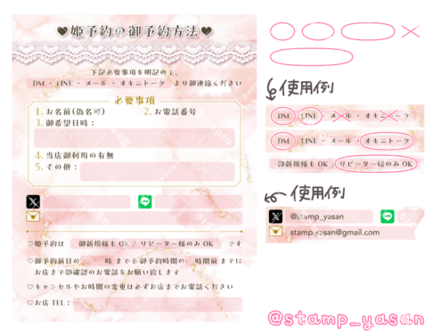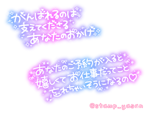「がんばれるのは支えてくださるあなたのおかげ」「あなたのご予約が入ると嬉しくてお仕事だってこと忘れちゃいそうになるの」のスタンプ