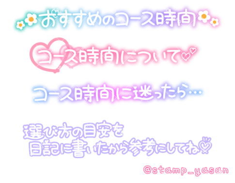 「おすすめのコース時間」「コース時間について」「コース時間に迷ったら…」「選び方の目安を日記に書いたから参考にしてね」のスタンプ