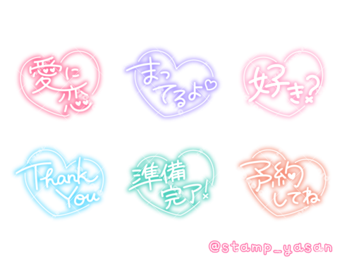 「愛に恋」「まってるよ」「好き?」「Thank you」「準備完了!」「予約してね」のスタンプ