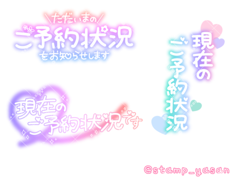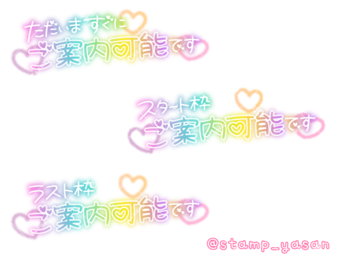 「ただいますぐにご案内可能です」「スタート枠ご案内可能です」「ラスト枠ご案内可能です」のスタンプ