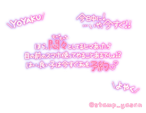 「YOYAKU」「今日中に!…いや、今すぐ!!」「ほら、悶々としてるヒマあったら目の前のスマホ使ってやることあるでしょ!?はい、良い子は今すぐ私を予約」「よやく」のスタンプ