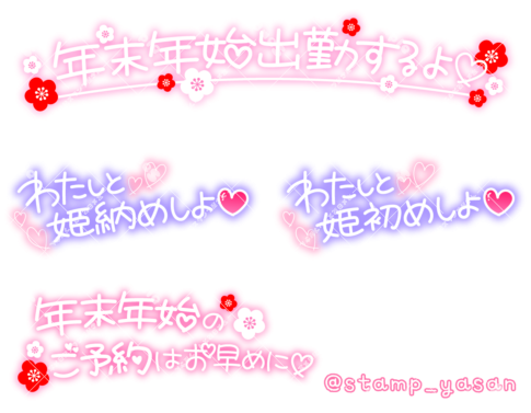 「年末年始出勤するよ」「年末年始のご予約はお早めに」「わたしと姫納めしよ」「わたしと姫初めしよ」のスタンプ