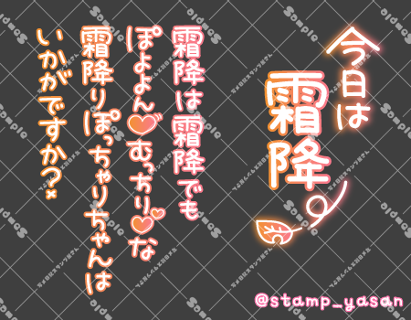 「今日は霜降(そうこう)」「暦の上では秋も終盤 朝晩の冷え込みで体調崩さないようにね」のスタンプ(縦書き)