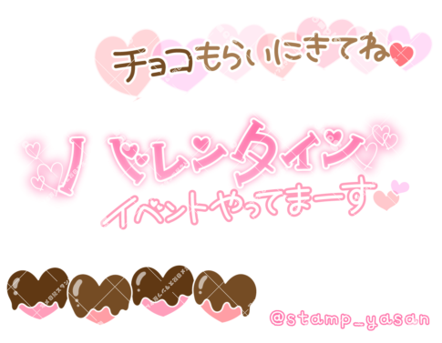 「バレンタインイベントやってまーす」「チョコもらいにきてね」のスタンプ