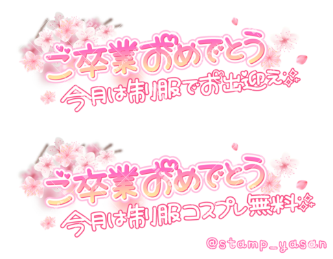 「ご卒業おめでとう 今月は制服でお出迎え」「ご卒業おめでとう 今月は制服コスプレ無料」のスタンプ