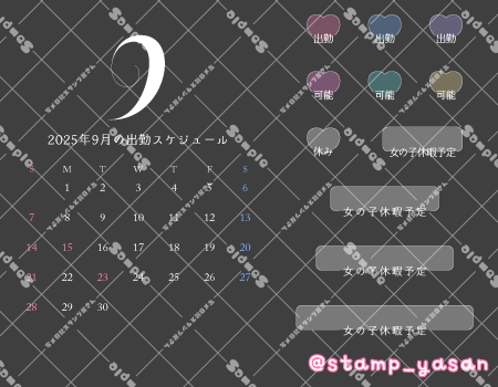 2025年9月のカレンダースタンプ(日曜始まり)