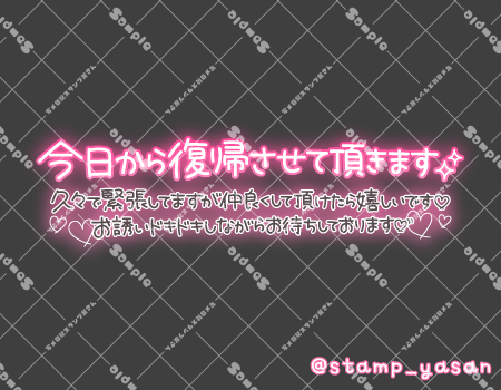 「今日から復帰させて頂きます 久々で緊張してますが仲良くして頂けたら嬉しいです♡お誘いドキドキしながらお待ちしております♡」のスタンプ