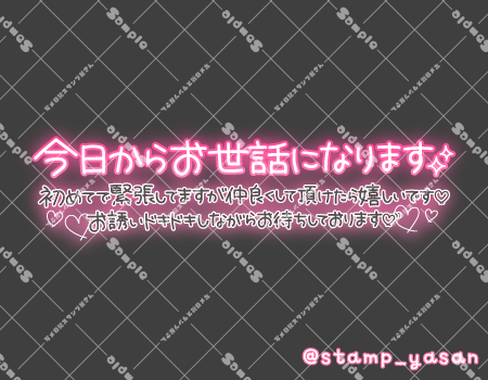「今日からお世話になります 初めてで緊張してますが仲良くして頂けたら嬉しいです♡お誘いドキドキしながらお待ちしております♡」のスタンプ