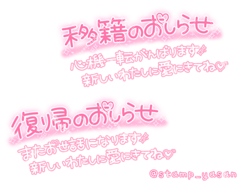 「移籍のおしらせ 心機一転がんばります 新しいわたしに愛にきてね」「復帰のおしらせ またお世話になります 新しいわたしに愛にきてね」のスタンプ