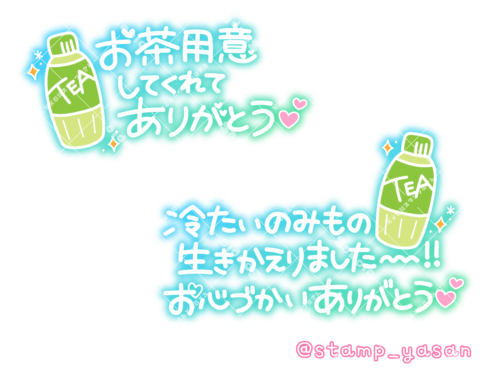 「お茶用意してくれてありがとう」「冷たいのみもの生きかえりました〜」のスタンプ