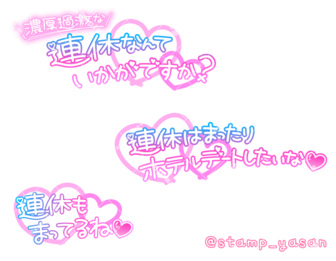 「濃厚過激な連休なんていかがですか?」「連休はまったりホテルデートしたいな」「連休もまってるね」のスタンプ