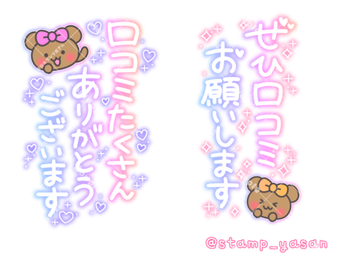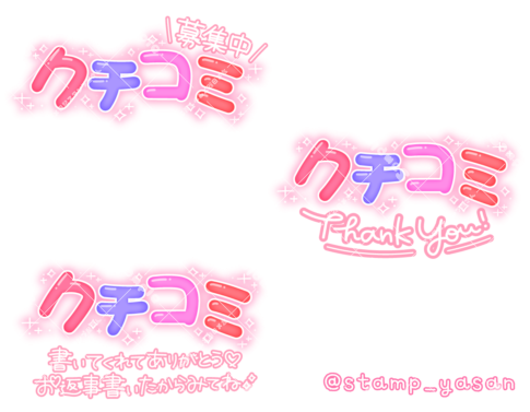 「クチコミ募集中」「クチコミThank you!」「クチコミ書いてくれてありがとう♡お返事書いたからみてね」のスタンプ