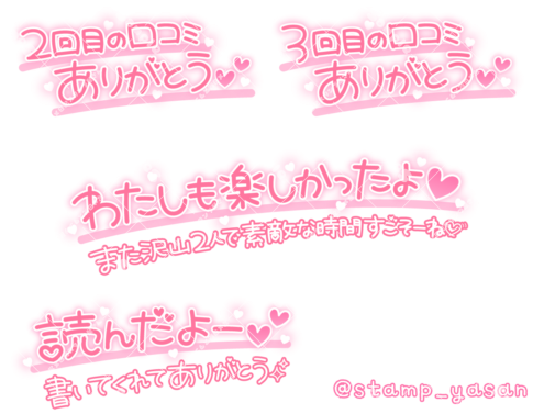 「2回目の口コミありがとう」「3回目の口コミありがとう」「わたしも楽しかったよ また2人で素敵な時間すごそーね」「読んだよー 書いてくれてありがとう」のスタンプ