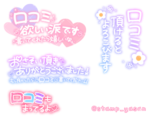 「口コミ欲しい派です」「口コミ頂けるとよろこびます」「おさそい頂きありがとうございました!もし良かったら口コミ書いてください!!」「口コミもまってるよ」のスタンプ