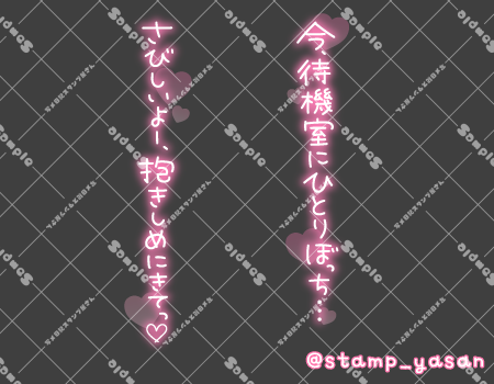 「今、待機室にひとりぼっち…」「さびしいよー、抱きしめにきてっ」のスタンプ(縦書き)