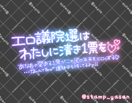 「エロ議院選はわたしに清き1票を♡あなたの愛ある1票がこの国の未来をエロくする♡…なーんてねww連休中も待ってるよー!!」のスタンプ