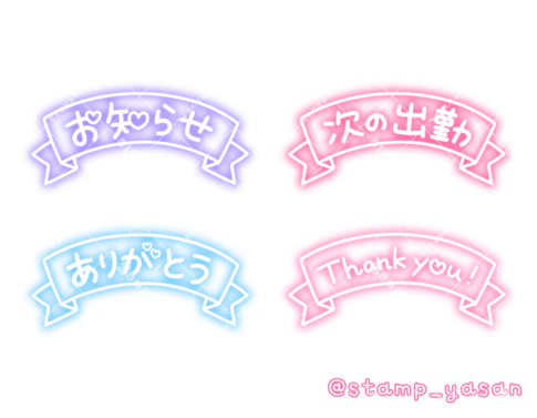 「お知らせ」「次の出勤」「ありがとう」「Thank you」のリボンタイトルスタンプ