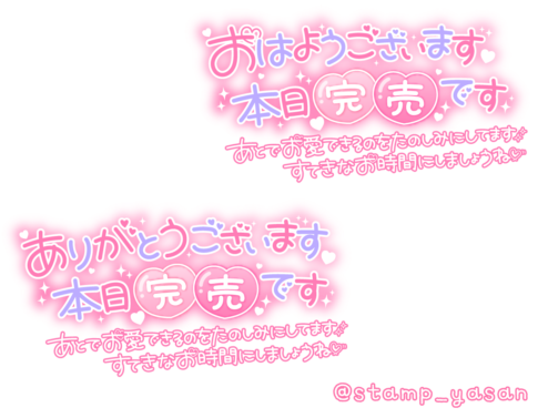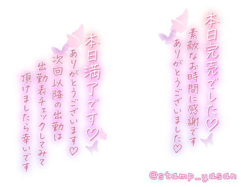 「本日完売でした 素敵なお時間に感謝です ありがとうございました」「本日満了です ありがとうございます 次回以降の出勤は出勤表チェックしてみて頂けましたら幸いです」のスタンプ(縦書き)