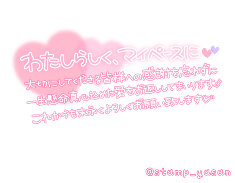 「わたしらしく、マイペースに 大切にしてくださる皆様への感謝を忘れずに一生懸命真心込めた愛をお返ししてまいります これからも末永くよろしくお願い致します」のスタンプ
