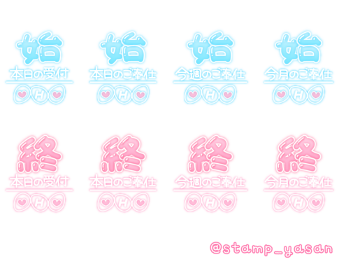「今日(明日)は出勤 ご予約ありがとう またあとでね」「今日(明日)は出勤 空き有ります お電話してね」「これから逢いに行くね」のスタンプ