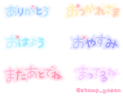 「ありがとう」「おつかれさま」「おはよう」「おやすみ」「またあとでね」「まってるね」のスタンプ