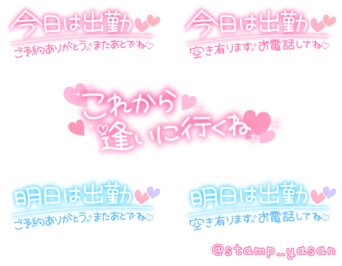 「今日(明日)は出勤 ご予約ありがとう またあとでね」「今日(明日)は出勤 空き有ります お電話してね」「これから逢いに行くね」のスタンプ