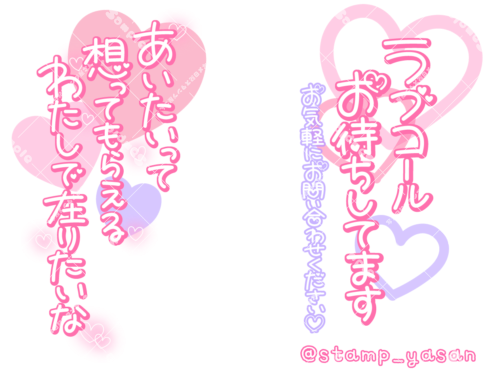「ラブコールお待ちしてます お気軽にお問い合わせください」「あいたいって想ってもらえるわたしで在りたいな」のスタンプ(縦書き)