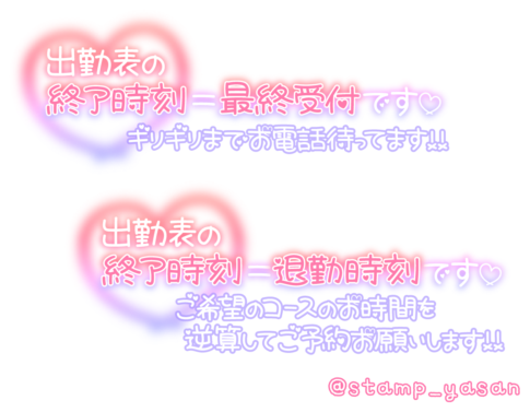 「出勤表の終了時刻=最終受付です ギリギリまでお電話待ってます!!」「出勤表の終了時刻=退勤時刻です ご希望のコースのお時間を逆算してご予約お願いします!!」のスタンプ