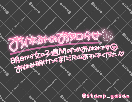「お休みのお知らせ 明日から女の子週間のためお休みです お休み明けたらまた沢山遊んでください♡」のスタンプ