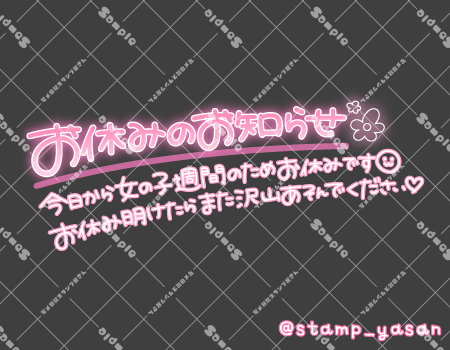 「お休みのお知らせ 明日から女の子週間のためお休みです お休み明けたらまた沢山遊んでください♡」のスタンプ