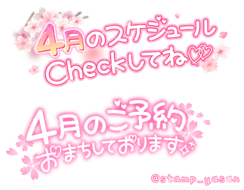 「4月のスケジュールCheckしてね」「4月のご予約おまちしております」のスタンプ