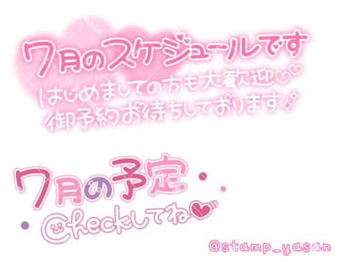 「7月のスケジュールです はじめましての方も大歓迎 御予約お待ちしております」「7月の予定 Checkしてね」のスタンプ